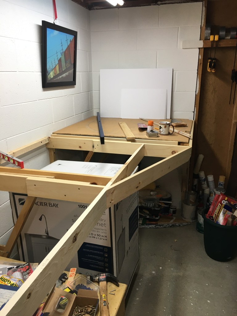 After I was satisfied with the placement of the braces, I added facia across the front of the braces to make a solid foundation for the edge of the plywood surface. I will probably attach a piece of thin material across plywood edge for a finished look.