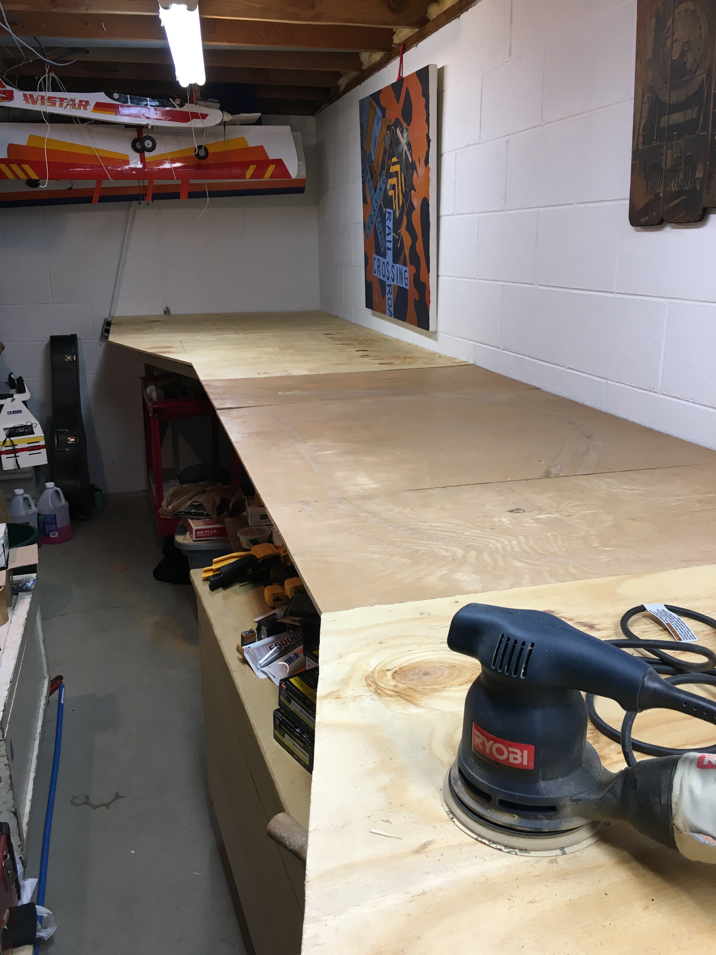 I have one brace on each of the outside walls. The braces are about 50 inches from the back wall and are perpendicular to the remaining braces. I left 4 inches of overhang across the entire front of the layout. In this photo it’s clear that I used two 1×3 inch joists on either side of the arm brace. My first shelf layout was only 24 inches deep in the middle, 48 inches on the ends. To use these braces again I had to add additional pieces of 1×3.