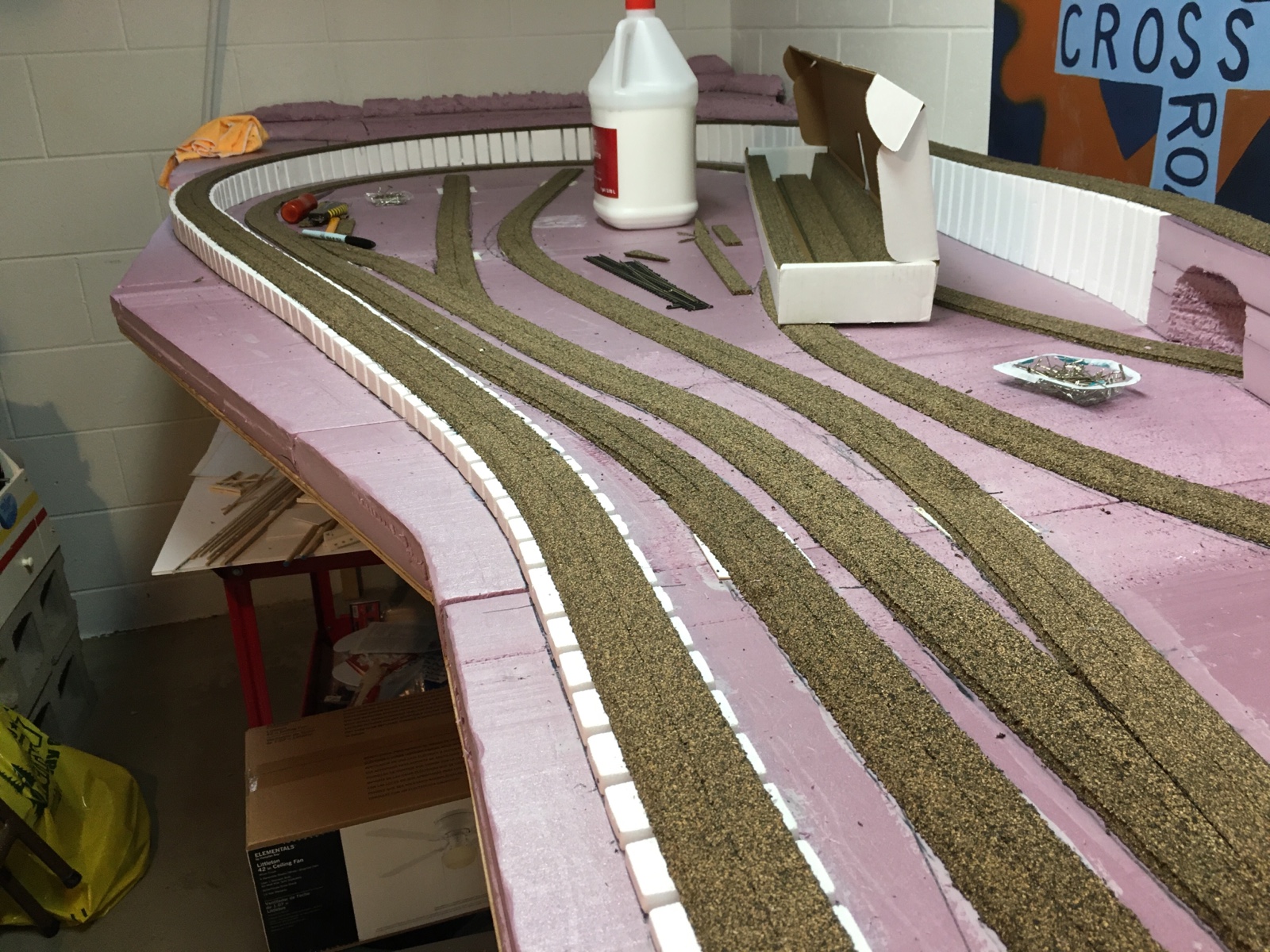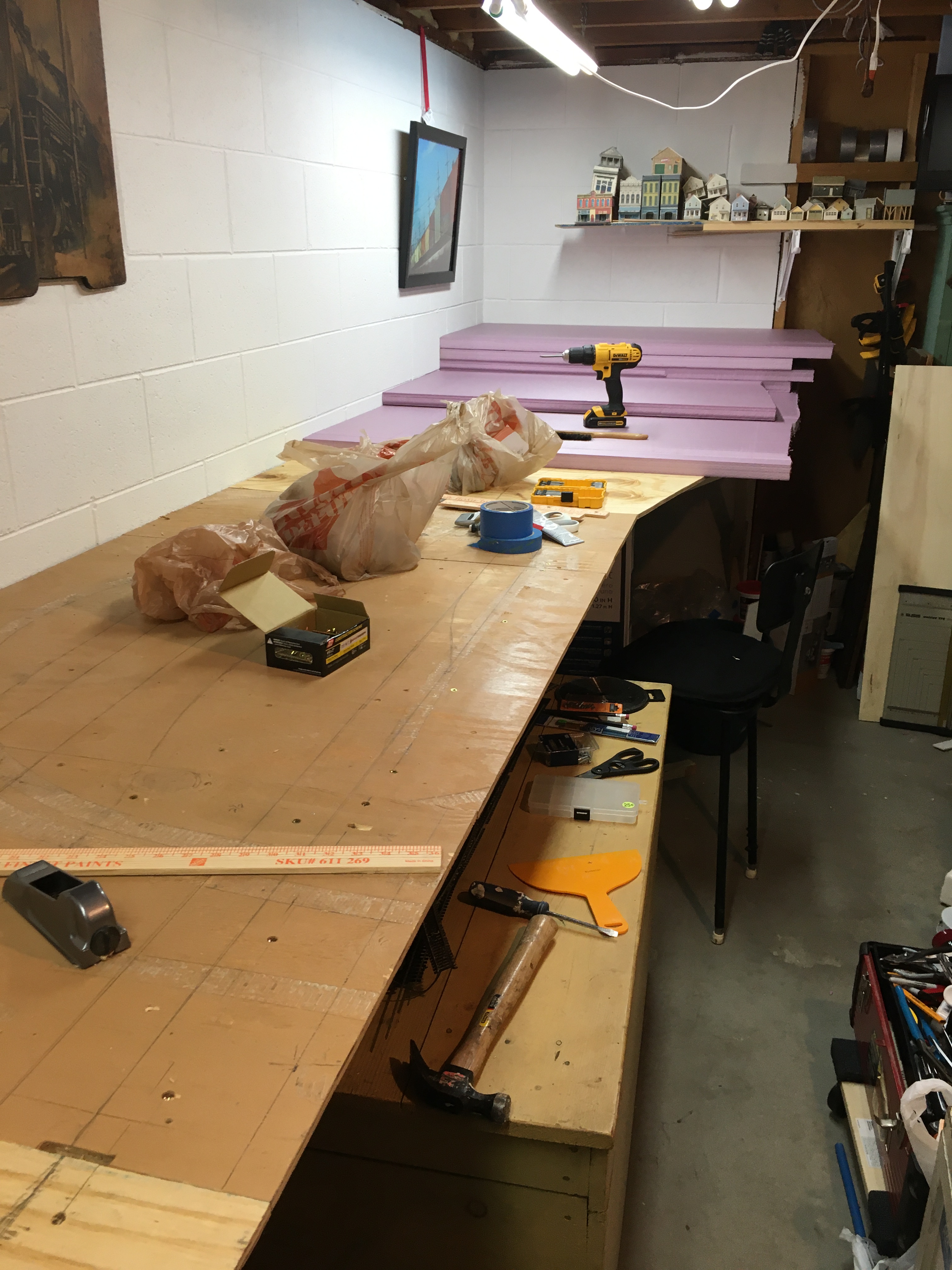 When all of the plywood surface pieces were firmly in place, it was time to begin laying down the extruded foam. I almost decided against using foam. It was actually my wife who talked me into it because of the versatility it provides with scenery and track placement. I had also decided not to use elevated track, which meant no mountain areas, no trestles, no inclines and declines. Again, my wife helped me see the light.