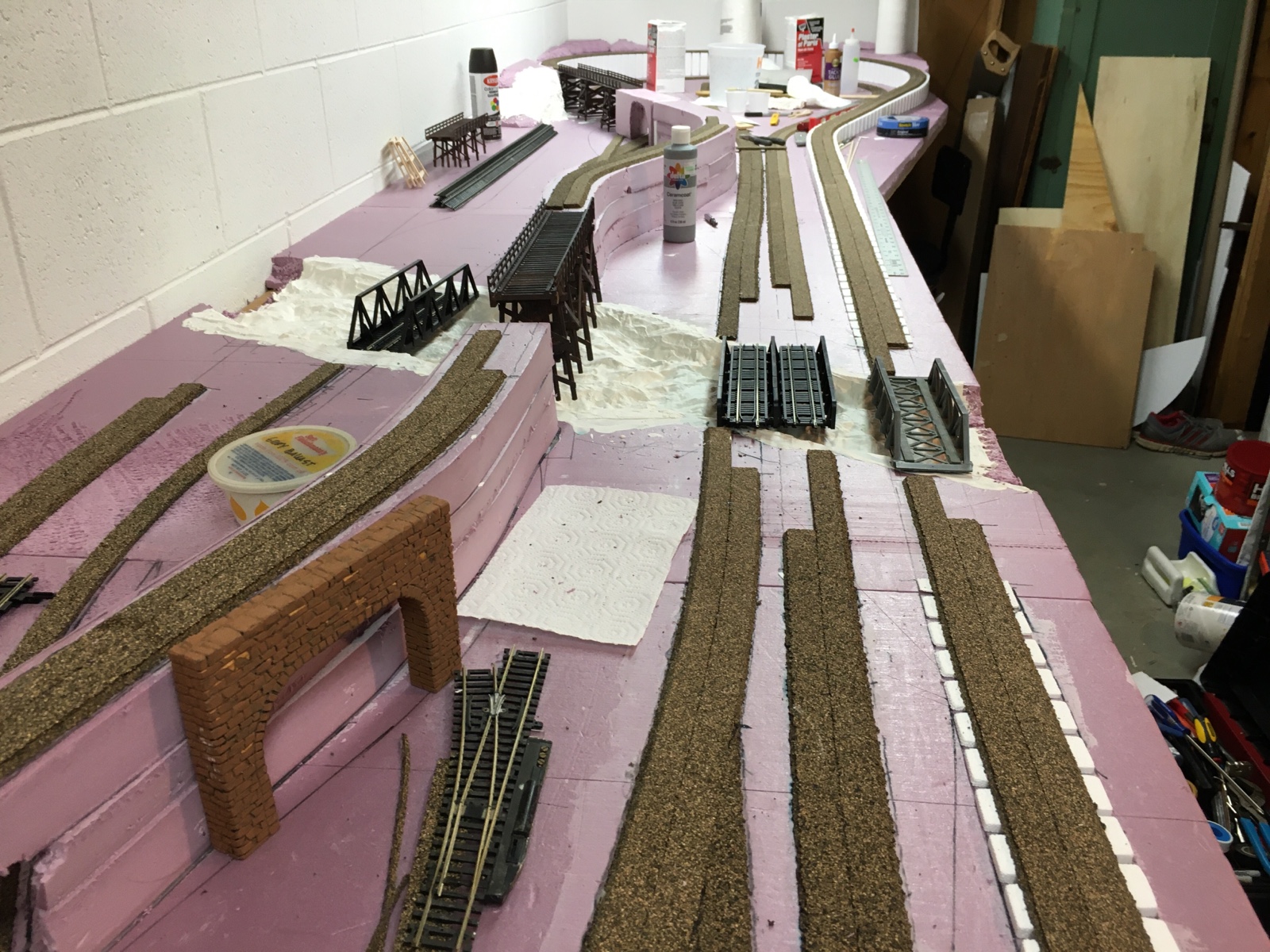 As I said in my previous post, this layout is 54 inches deep on the ends, 36 inches across the middle. I wouldn’t recommend building a shelf layout this wide, but I’m tall so reaching across won’t be that difficult. Using a step stool to work on scenery at the ends will work fine.