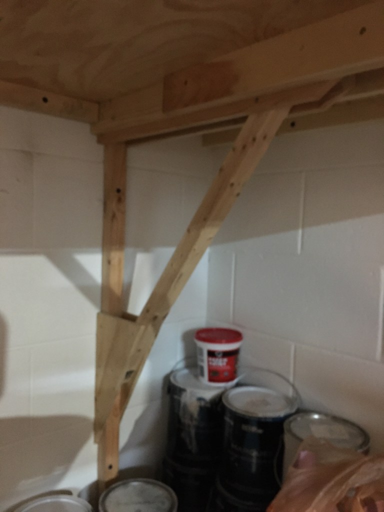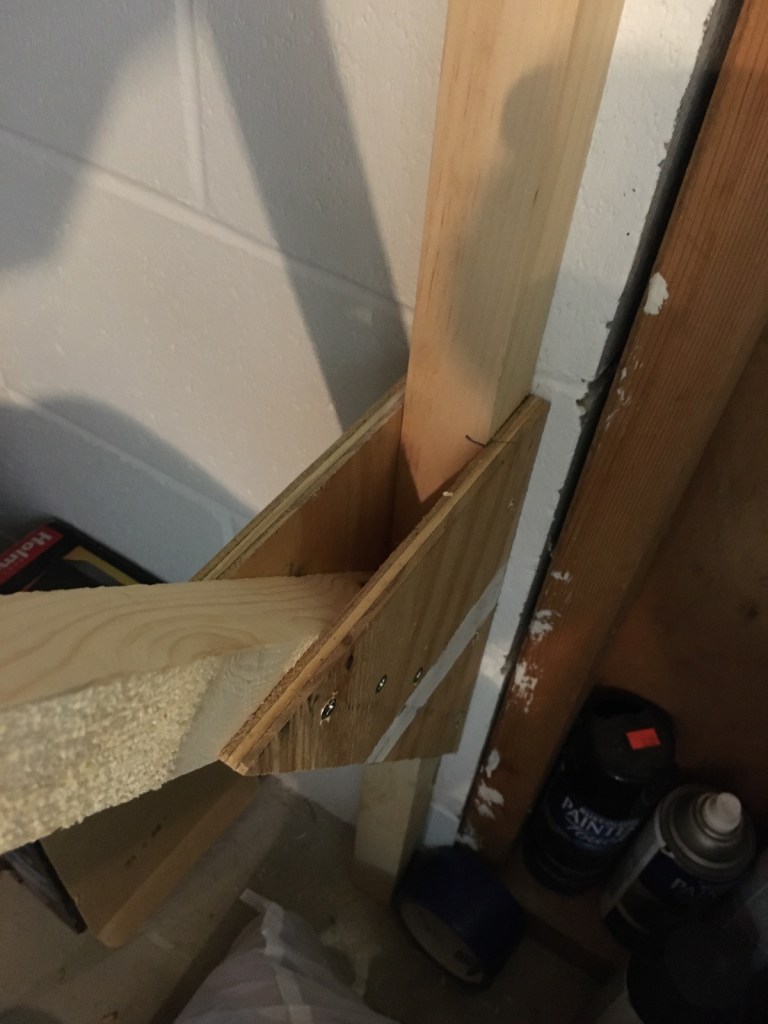 You can’t see them in this photo, but there are two concrete screws anchoring the leg to the wall. One is just below the gusset, and one about half way between the top of the brace and the gusset.