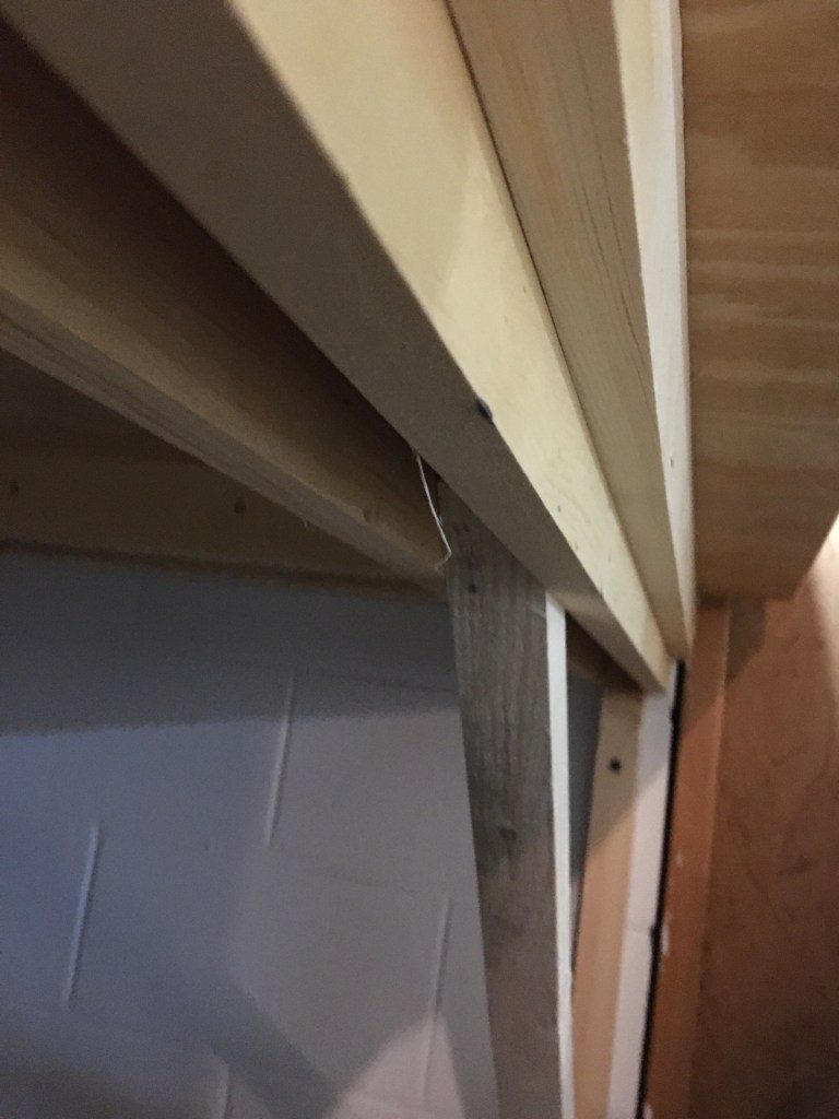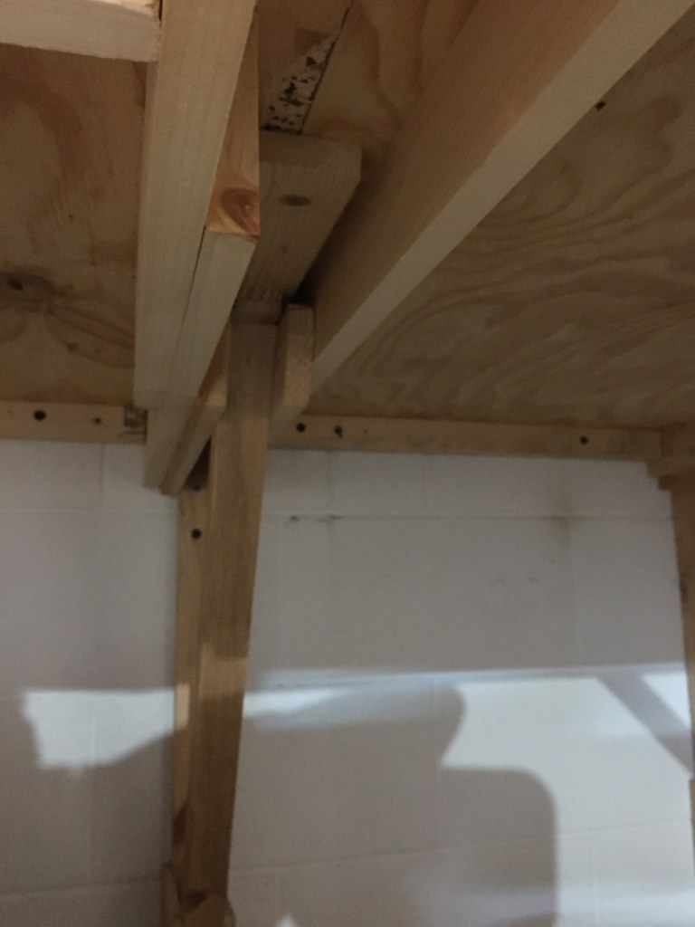 When I added the 3/8 inch plywood deck, I measured from the center of the brace to the next brace center, and cut the plywood accordingly. By doing that, the edges of the plywood came together in the middle of the joists, creating a solid connection.