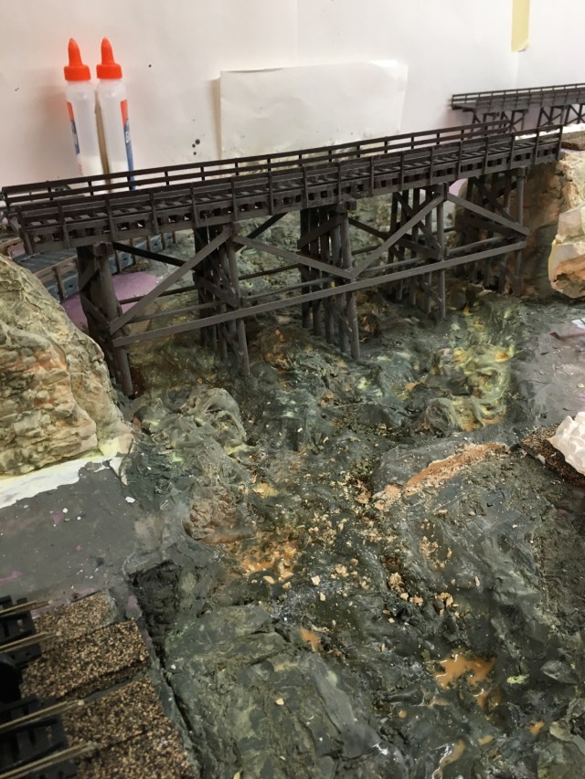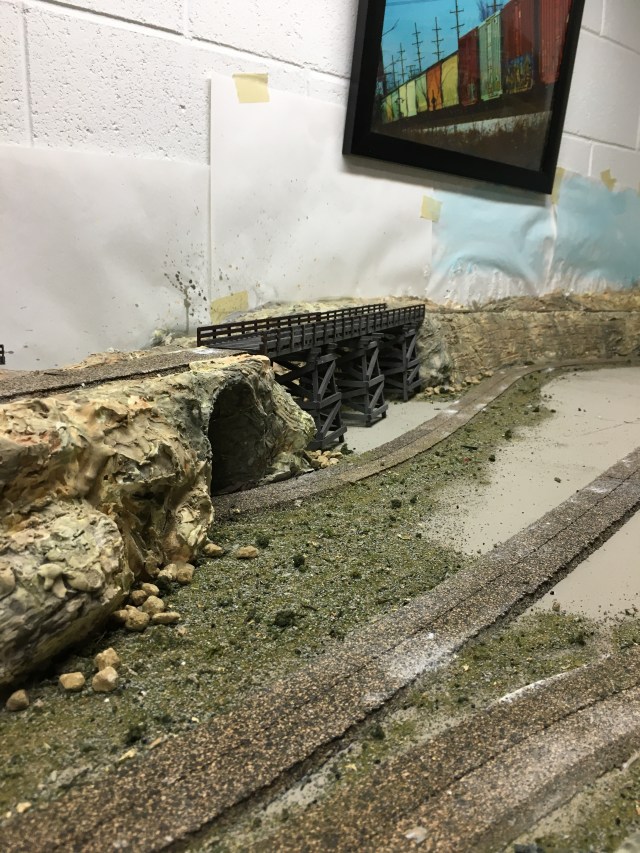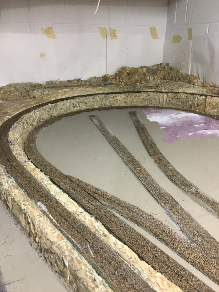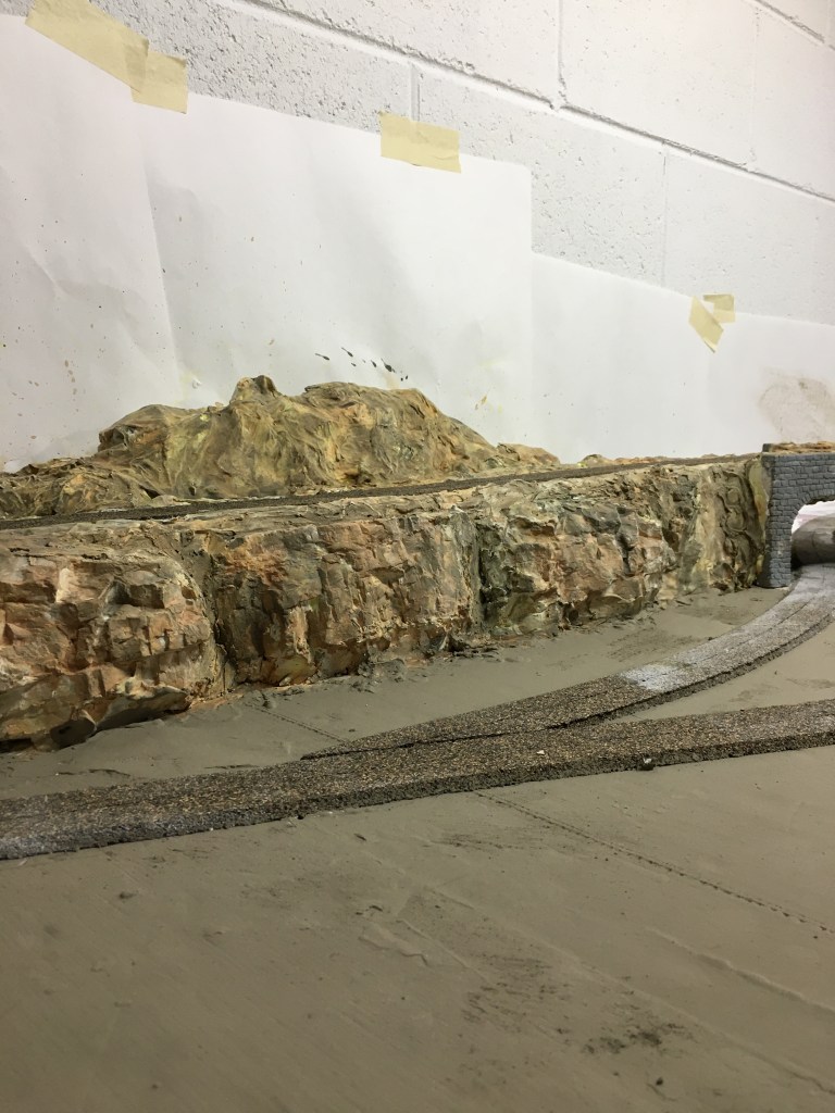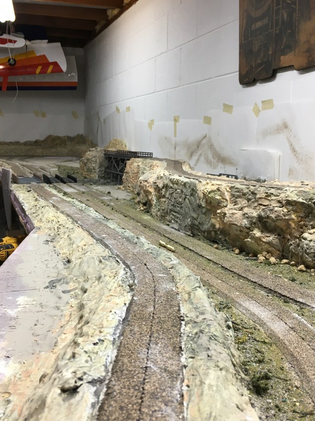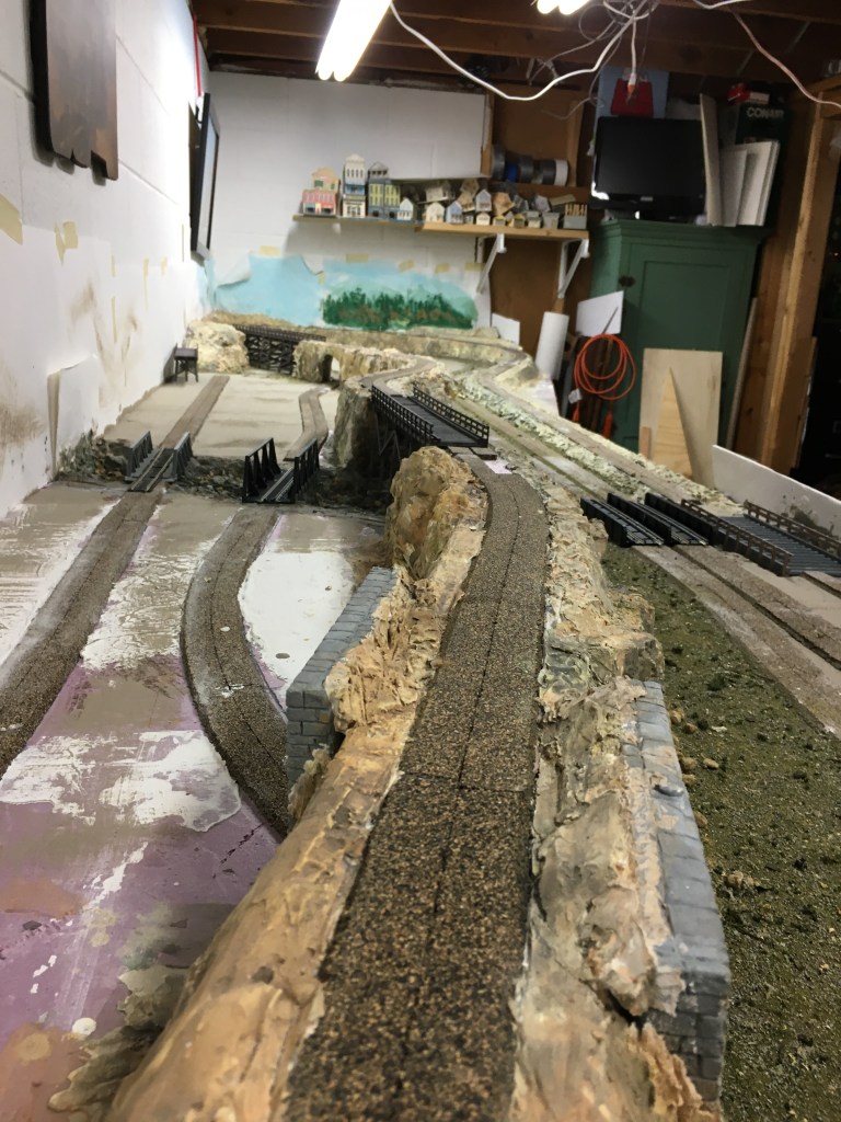 Believe it or not, laying flex-track is easy compared to everything I’ve already done. This is the most detailed layout I have ever built. The biggest challenge remaining is painting the backdrop. The paper visible in some of the photos is just to protect the white walls from plaster and paint splash. I was going to use a paintable material on the wall as a canvass but my daughter, who is an art teacher and accomplished artist, recommends painting directly on the wall. She has even volunteered to paint the backdrop for me. I might want to do it myself. We’ll see.