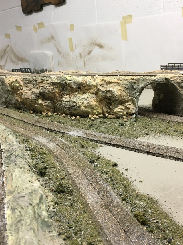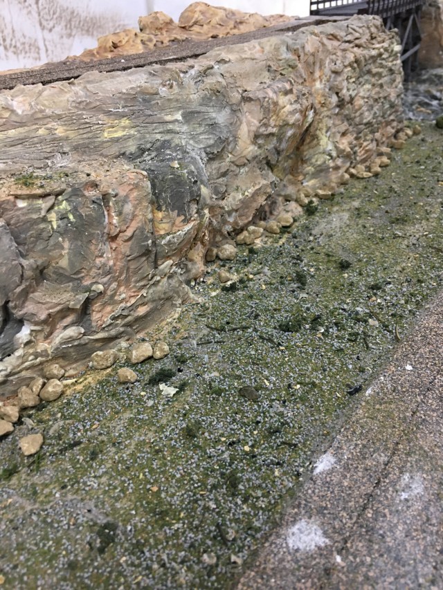 Placing and painting the plaster rocks I made using Woodland Scenics molds was a challenge. I watched several videos for inspiration but it finally came down to just doing it. I immediately discovered how quickly liquid plaster hardens when it contacts the plaster rocks. I took a few missteps before getting it right.