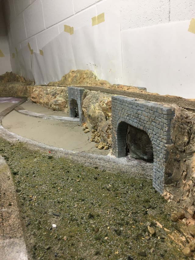Applying plaster to the insides of my short tunnels, three of them, was another learning experience. I scooped up some plaster in my hand and reached into the tunnel, smearing the mix on the walls and roof. After each application I waited a few minutes before inspecting to see whether I needed more. When the inside was finished, I applied the plaster portals to the tunnel face then painted the inside with a gray wash.