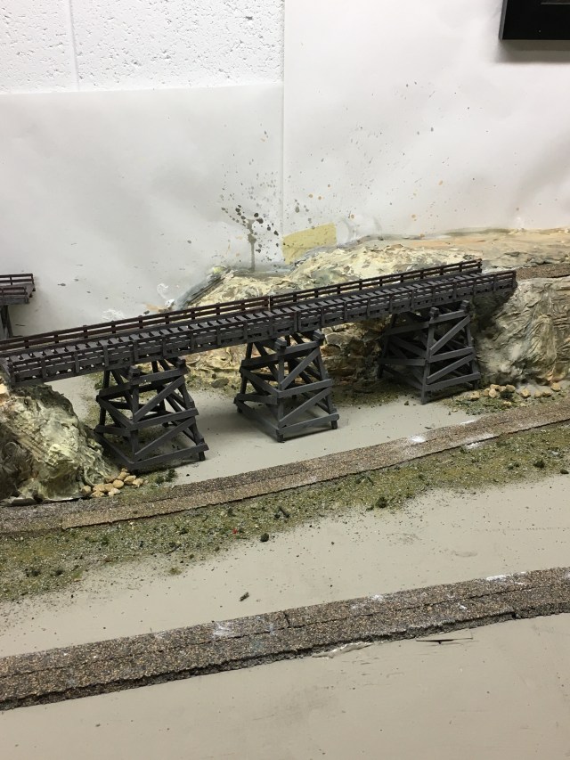 My bridge near the town of Maple Valley wasn’t as difficult to deal with. It’s a deck supported by three wood structures so leveling everything was much easier. Preparing the area under the bridge with some ground cover and weeds before gluing it in place makes the scenery task a snap.