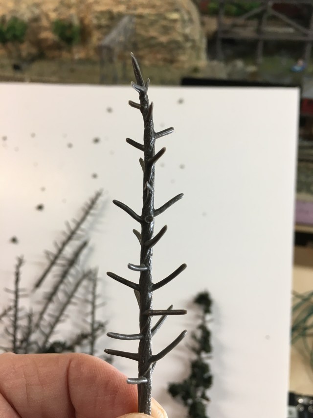 I was lucky enough to find two complete pine tree kits, about thirty trees all together. The first job is to twist the tree armatures as they are flat in the kit. I hold the top with a pair of pliers, and twist the trunk until I’m happy with the look.