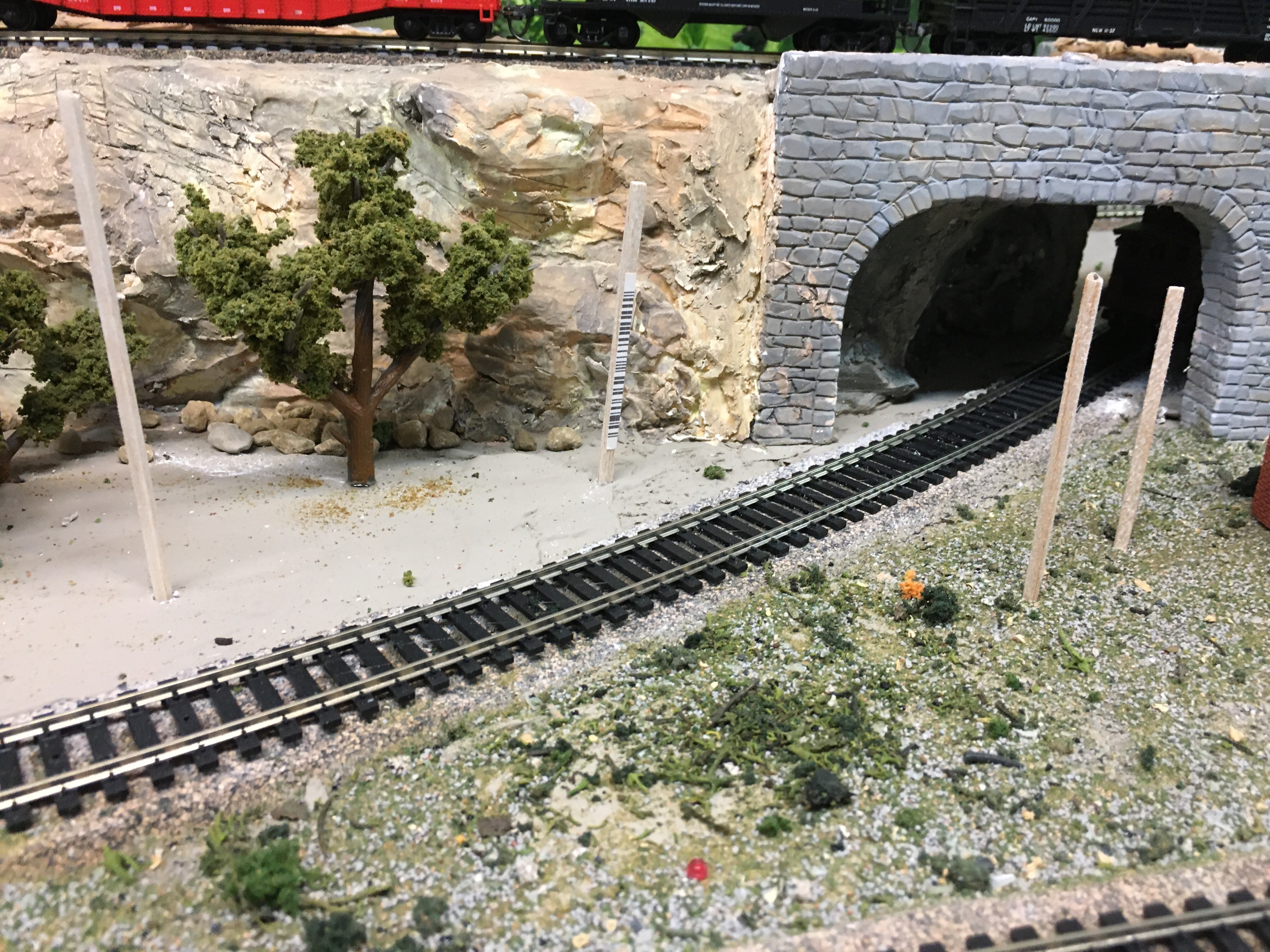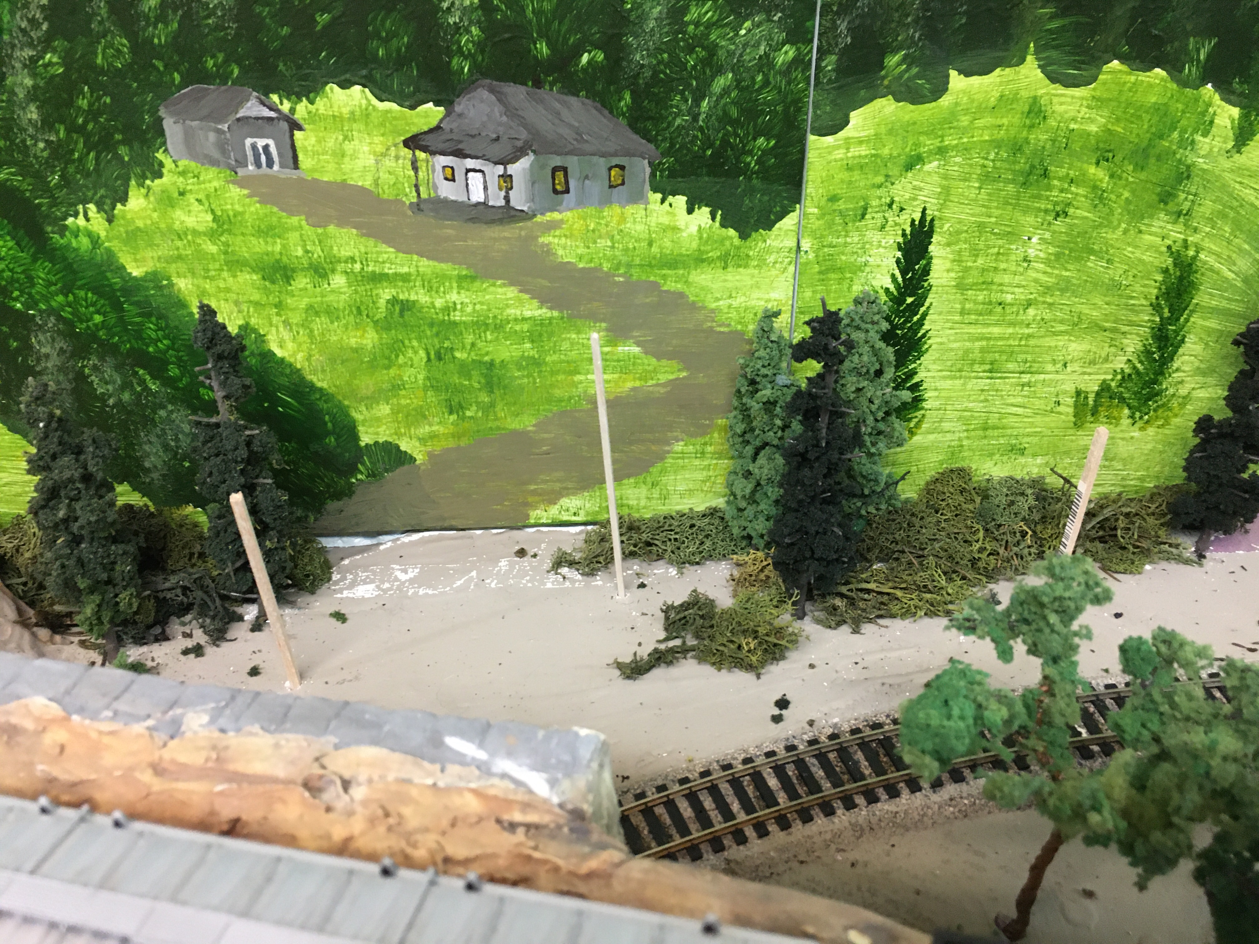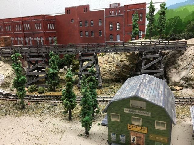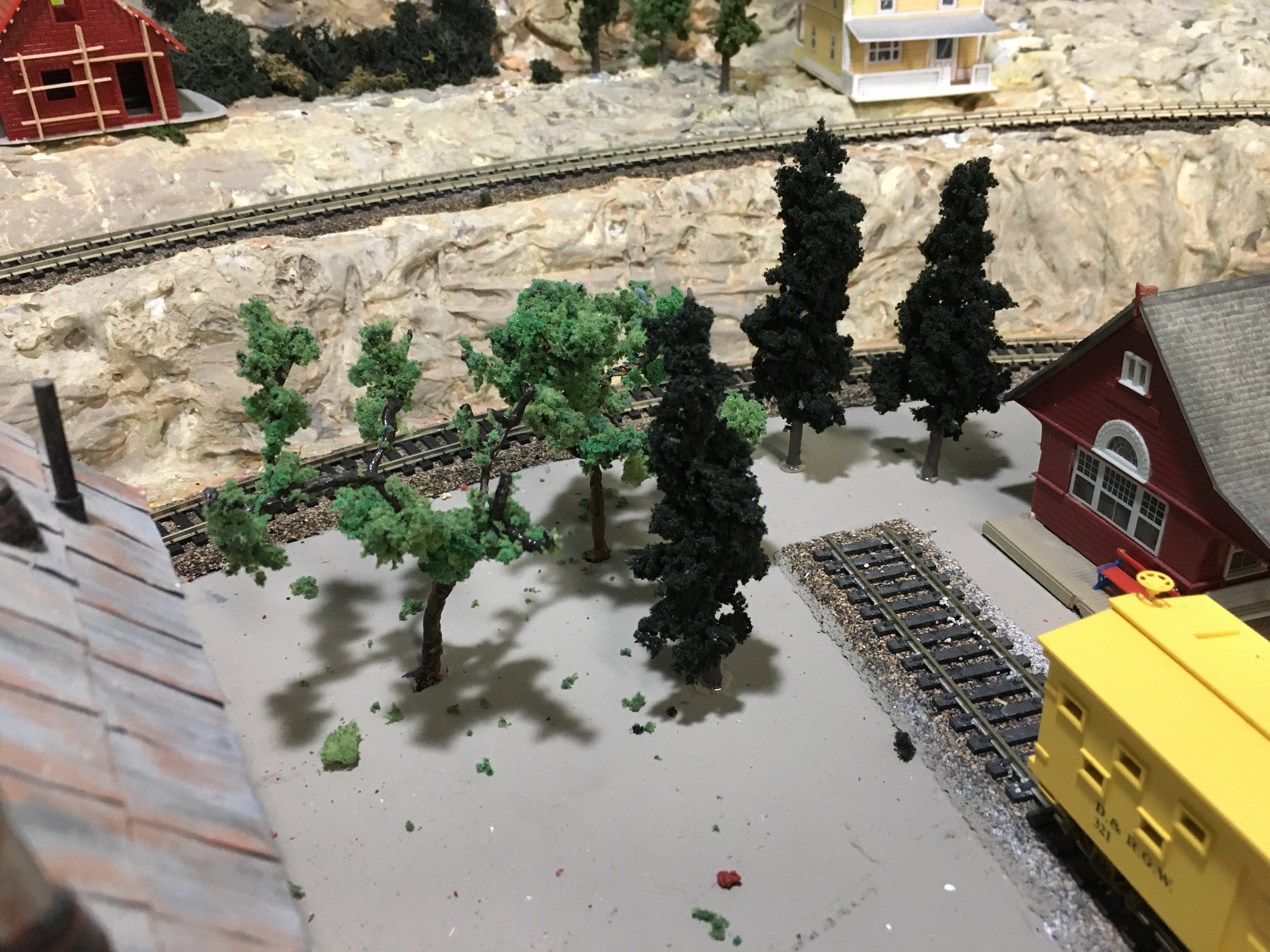 My layout has semi-mountainous, rocky scenes with both conifer and deciduous trees. I planted most of the deciduous trees in areas where my houses and buildings are. The mid-section of the Maple Valley Short Line is an industrial area with a few trees along the painted backdrop of hills and trees.