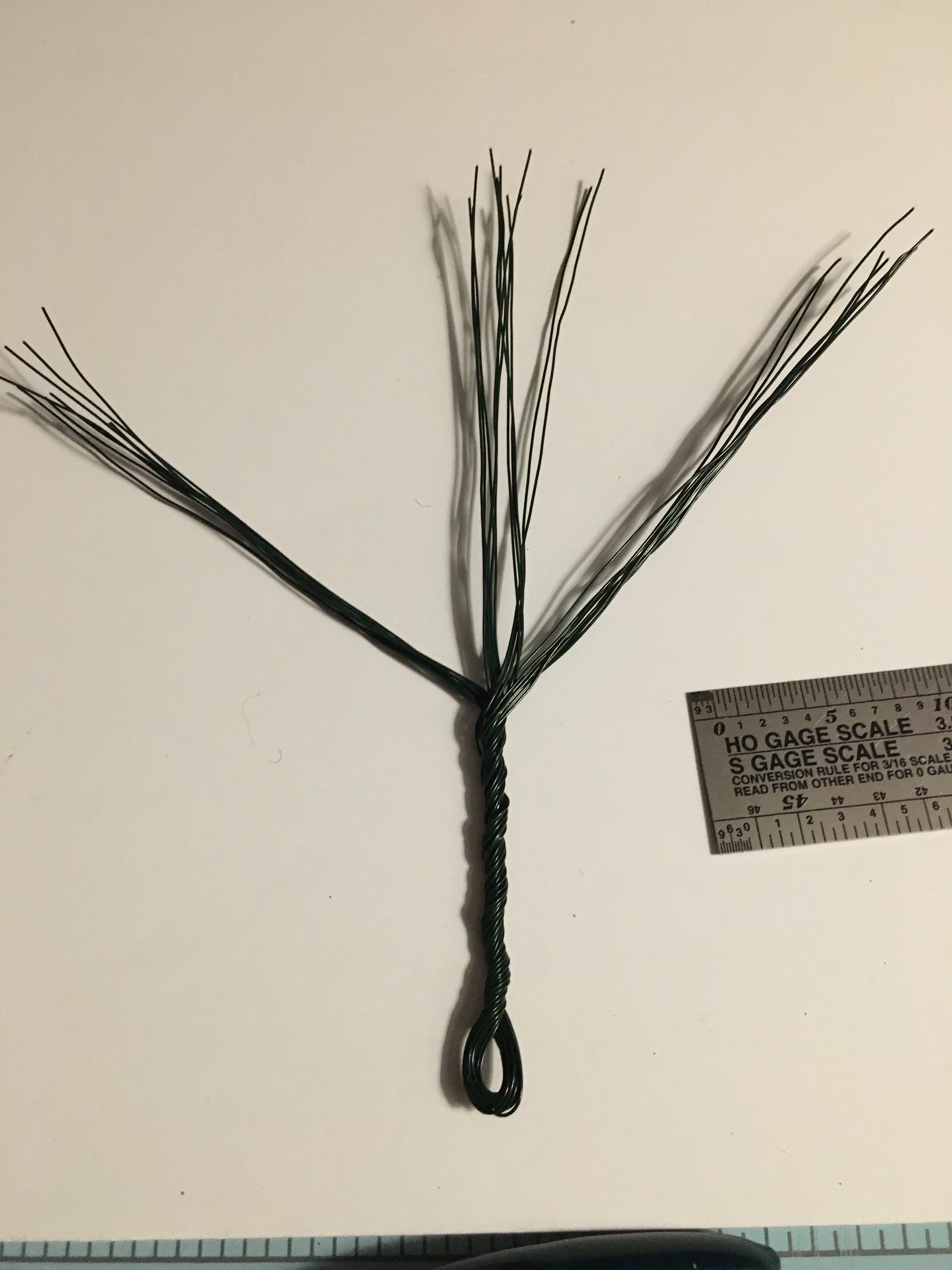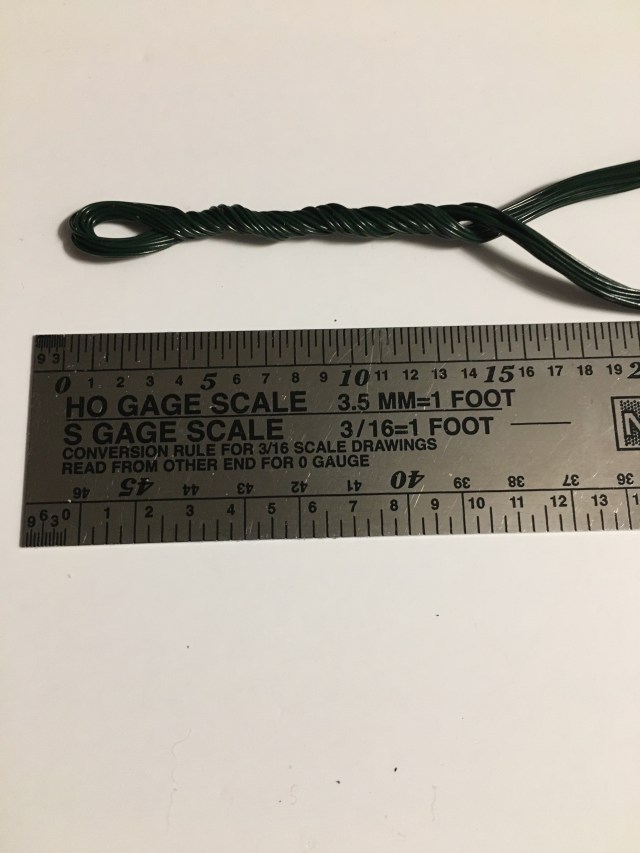 3. While gripping the end, and placing your index finger between the two strands of wire, begin twisting the two strands together tightly. (Since the wire is so thin, the twisted wires will easily hold their shape.) As you can see on the HO scale ruler, the trunk of this tree will be about 14 feet tall.
