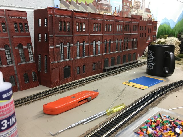 I started working on my backdrop factory two years ago. I don’t have enough space on my layout to use the factory as a free-standing kit. I started by cutting the pieces down so they could be glued together side-by-side. I have four inches of space between the wall and the rail siding.