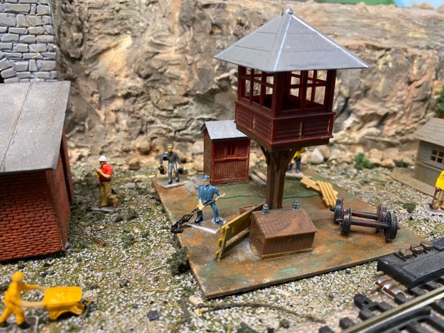 Lots of work to be done here, and I don’t mean by the guys in the scene. The edges have to be blended with ground cover. The tower and small sheds need paint and weathering. Many weeds are needed, the ground cover needs help. A little more brown will look better.