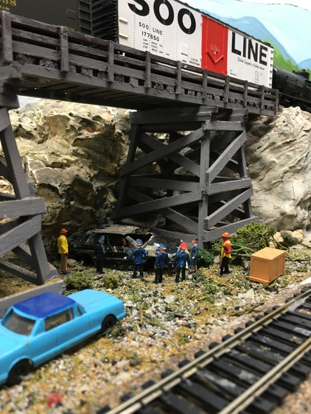 A few weeks later, I was down in the basement in my train room. I put the little mangled car under what is now called, “Three Tower Bridge.” That’s when it happened. I thought, “There’s a scandal in Maple Valley. Sylvia Meisner has been missing for two weeks and no one knows what happened to her. A burned car found under the bridge looks like hers.”