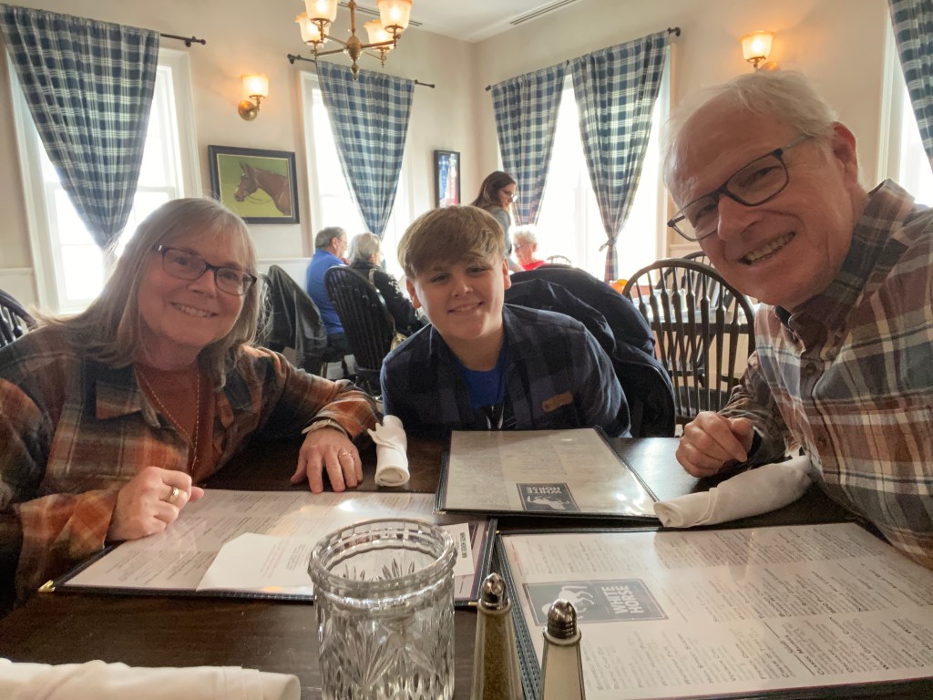 We enjoyed the holidays with our family. Today, we celebrated our anniversary with our grandson whose birthday is today. We had lunch at the White Horse Inn, in Metamora, Michigan. Mary mentioned to the waiter that we were celebrating. After dinner she came to our table with a plate of warm chocolate chip cookies, the one in the center held a lighted sparkler. She said, “Happy Birthday!”