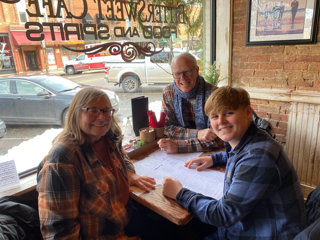 After we ate a cookie, we drove over to Holly to visit Altered Designs, and get dessert at The Bittersweet Cafe. We mentioned our celebration to the staff. When our dessert was served the waiter came to the table with the cook and they sang Happy Birthday. Then the waiter held up her finger and said, “It’s a birthday candle, blow it out!” And our grandson did.