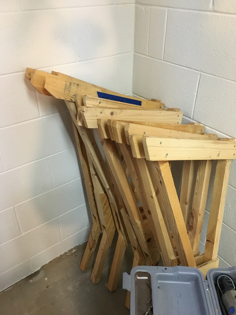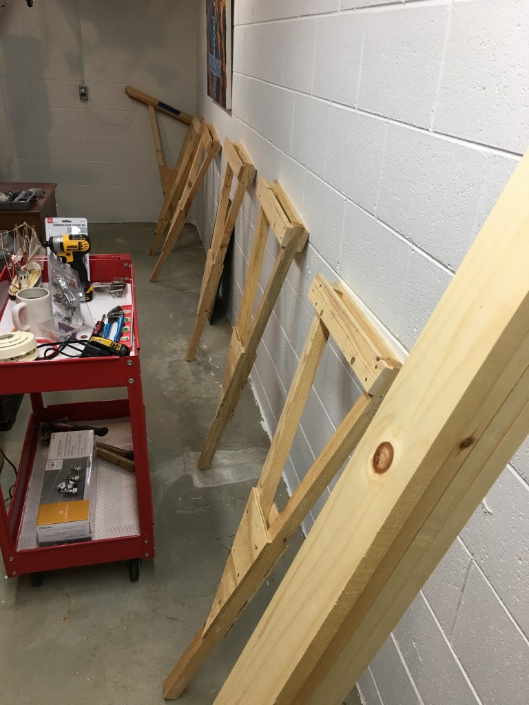 These are the leg braces I made for the layout. They are also the leg braces I used on my current layout, which is quite a bit larger. I just extended the joists about eight inches. They are strong enough to easily hold me, as it was necessary to get on top of the bench to finish laying the curved track on the back of the Maple Valley Short Line Model Railroad.