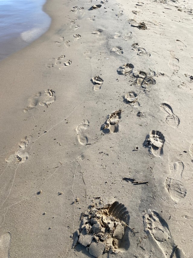 There are footprints large and small, some from shoes, others bare, all heading to or from. I wonder how long these footprints will last. They may already be gone, the wind and waves making a clean slate for new footprints in the sand.